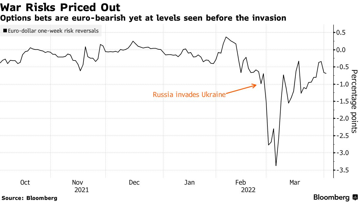 与此同时,期权押注为欧元描绘了不那么悲观的前景。作为市场头寸和市场人气晴雨表的风险逆转指标,已消化了乌克兰战争引发的波动,目前的处于今年早些时候的水平。