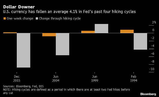 自2021年初以来,美元一直是外汇市场上的主导力量,鹰派美联储预期和战争带来的避险需求推动美元兑主要货币在过去五个季度中有四个季度走高。这将有助于在美联储加息之际支撑美元汇率——尽管有悖于历史经验。根据美联储和国际清算银行1994年以来的数据,在美联储前四个紧缩周期,美元平均贬值了4.1%。