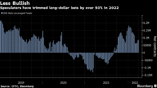 投机者也减少了看涨美元的押注。美国商品期货交易委员会的数据显示,杠杆基金的美元净多头仓位在1月份达到2019年以来的最高水平,但自那以来已减仓超过50%。