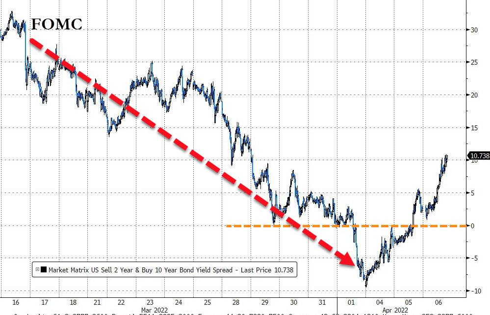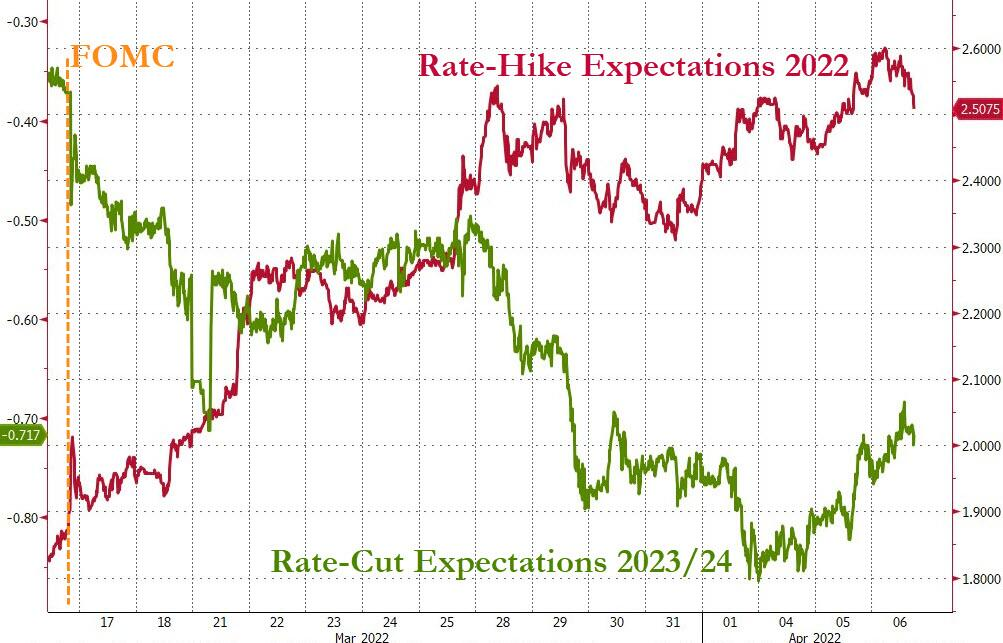 鉴于纪要的鹰派基调,市场对2022年再加息的预期已从6次飙升至9次,5月加息50个基点的可能性为82%。但同时,对2023-24年的降息预期已从1次飙升至超过3次。