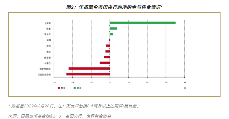 2月土耳其购入25吨黄金,主导了全球央行购金行为,其年初至今的总购金量也超过35吨(图2),黄金储备总量达到429吨(占总储备的27%)。印度在2月份购金2.6吨,黄金储备总量达到758吨。爱尔兰作为唯一活跃的发达市场黄金买家,本月增加了1吨的黄金储备,目前其黄金总持有量超过11吨,比2021年8月底爱尔兰开始购买黄金时高出88%。