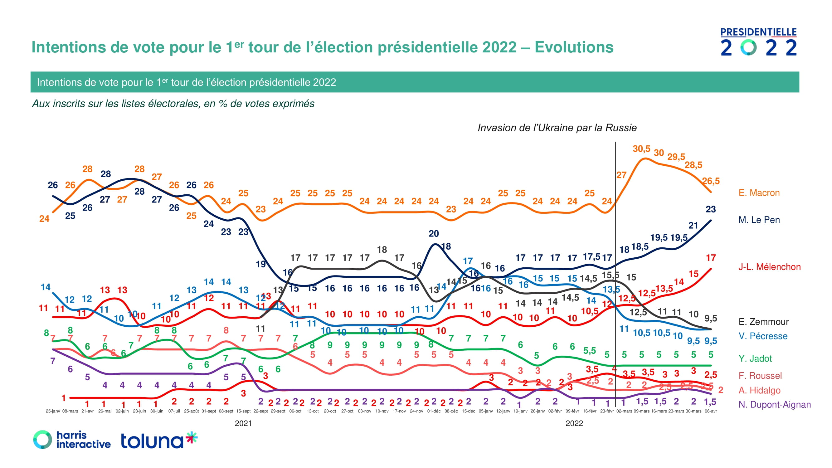 根据HarrisInteractive4月6日发布的民调,马克龙的首轮投票支持率为26.5%,第二轮支持率为51.5%,勒庞的支持率分别为23%和48.5%,这一结果在误差范围内。