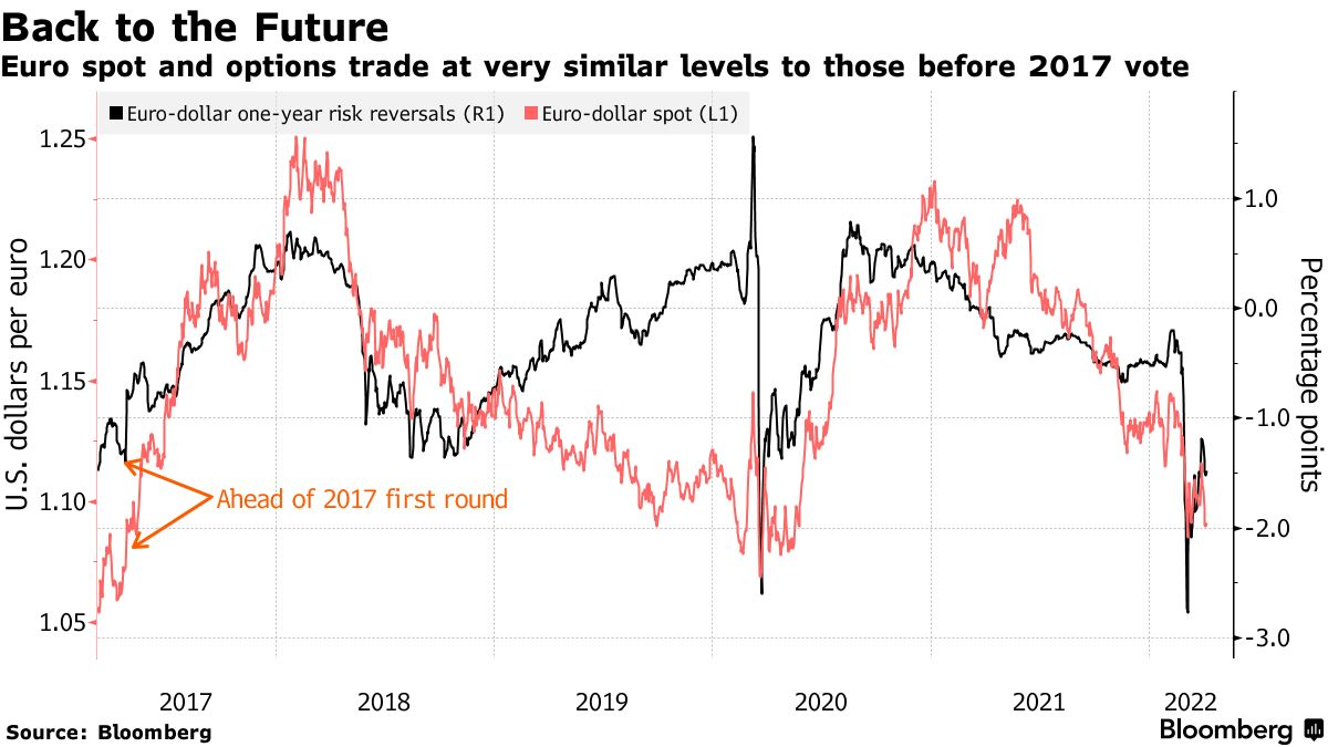 法国大选的风险给法国债券、股票和欧元带来了压力,它们本月下跌了1.4%。欧元期权市场上的看跌情绪目前处于与2017年公投前类似的水平,不过交易员也在对冲包括乌克兰冲突在内的风险。