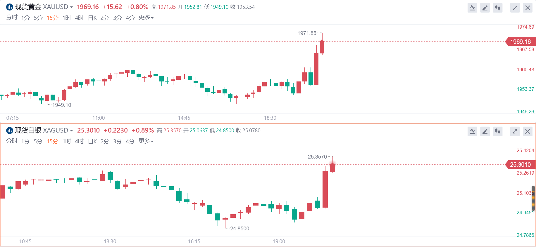 美国CPI数据公布后,现货黄金上破1970美元/盎司,为3月14日以来新高,日内涨超0.8%。现货白银日内涨幅扩大至1.00%。