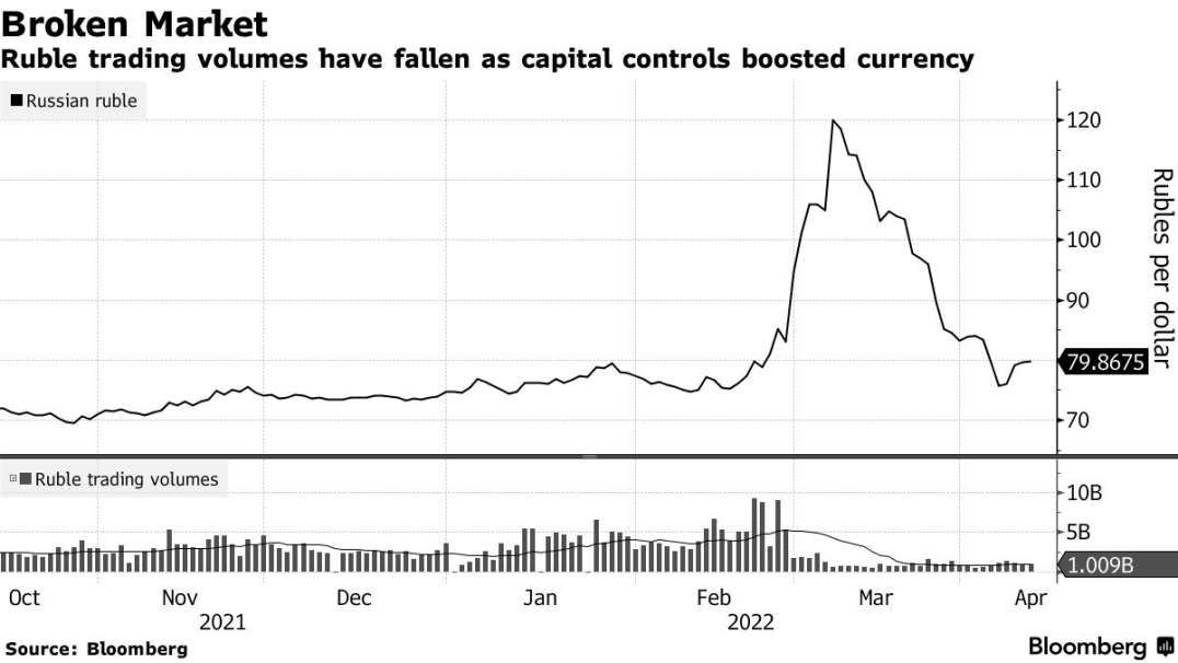 “俄罗斯正在获得大量外汇流入,但市场无法消化这一数量。交易量微不足道,没有外国投资者,没有离岸市场,没有算法交易,没有大玩家,甚至是本地的。”