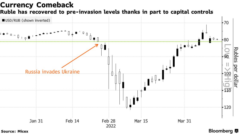 严格的资本管制导致外汇供需失衡,助长了卢布的反弹,帮助卢布收复了战争开始后的全部失地。据知情人士透露,随着大宗商品价格飙升,一些俄罗斯金属和矿业公司现在正努力出售大量的美元。