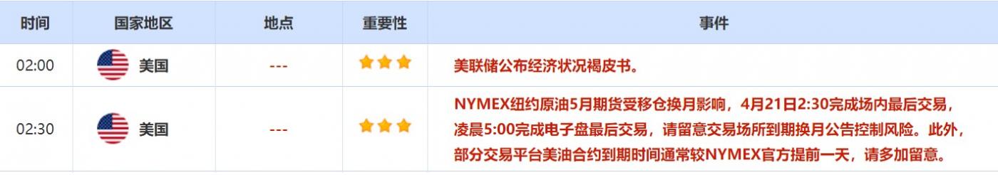 4月21日,美联储还将公布经济状况褐皮书,投资者也需对此保持关注。