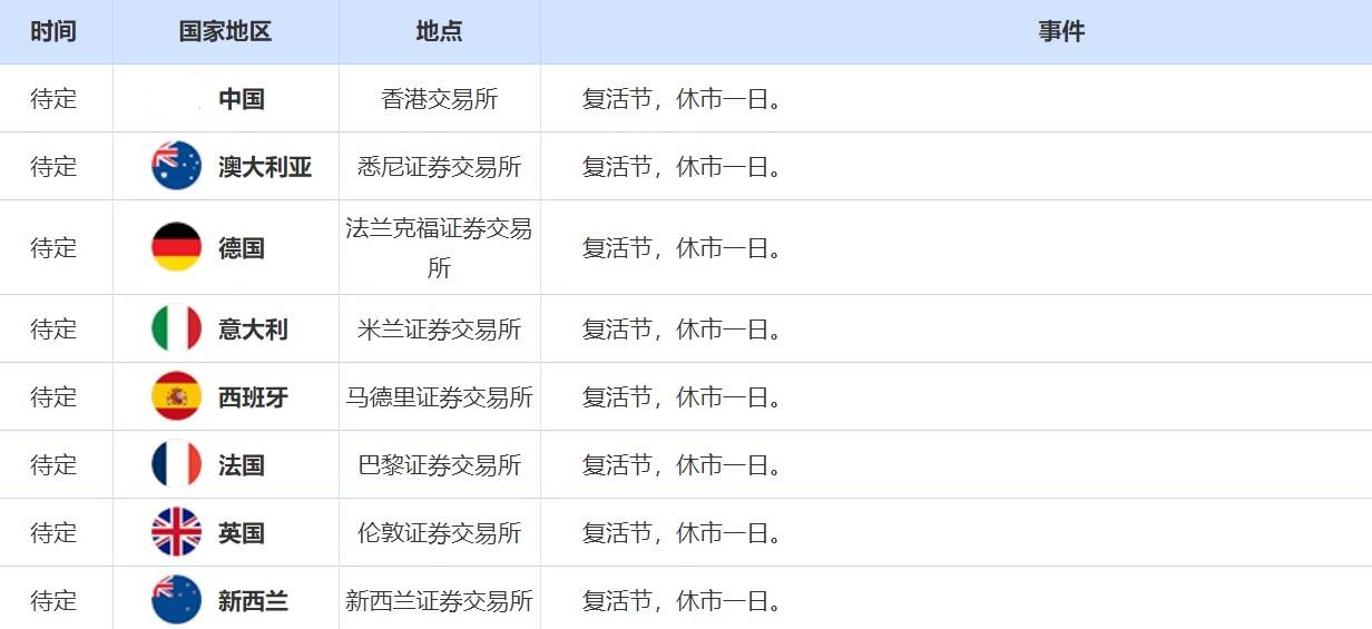 下周一因为复活节假期,投资者需关注各大交易所的休市公告。