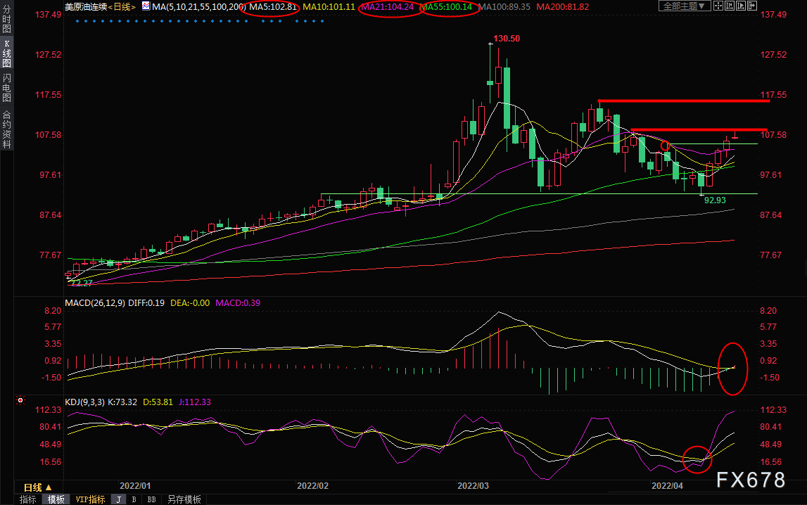 日线级别:震荡上涨;均线多头排列,MACD初步金叉,KDJ金叉,油价短线偏向多头,目前正试探3月30日高点108.75附近阻力,如果顶破该阻力,则有望进一步试探3月24日高点116.64附近阻力。短线的话,3月28日高点112.93附近也存在一些阻力。