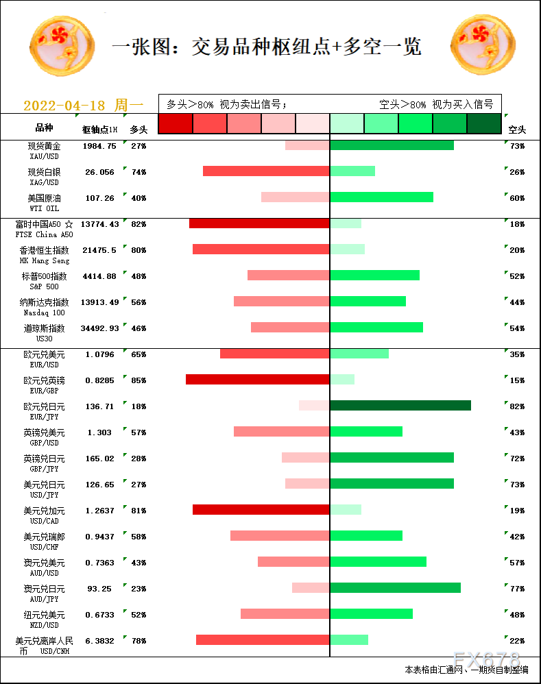 一张图:4月18日黄金白银、原油、股指、外汇“枢纽点+多空信号”;周一(4月18日)一张图看“枢纽点+多空信号”,品种包括:黄金、白银、原油、股指、欧元、英镑、日元、澳元、纽元、加元、富时中国A50、恒生指数、道指、标普500等。无惧多家央行加息举动 黄金以连阳走势回应