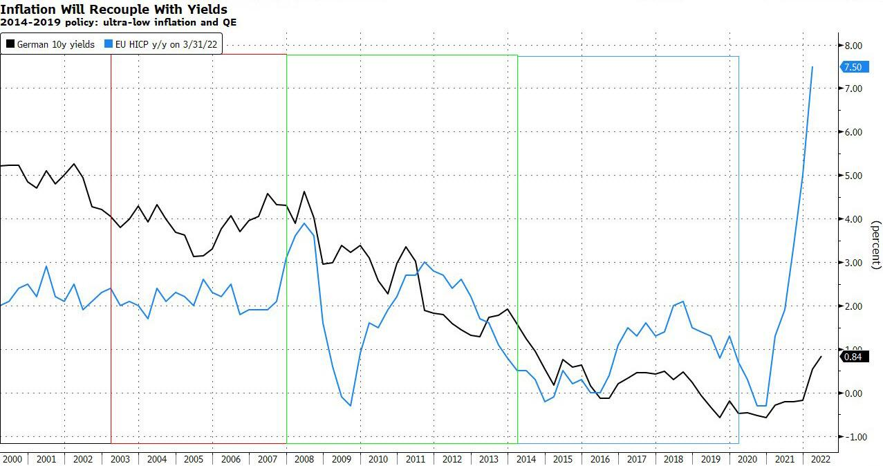 这一点之所以在欧洲表现得最为明显,是因为该地区的经济体相对更容易受到俄乌战争的影响。Read指出,在欧洲央行货币政策的第四阶段(蓝框),即超低通胀和量化宽松期间,我们已经习惯了无需担忧通胀的经济刺激政策。随着这种局面不复存在,未来几个月和几个季度,通胀与收益率之间的联动将在很大程度上受到通胀的主导。
