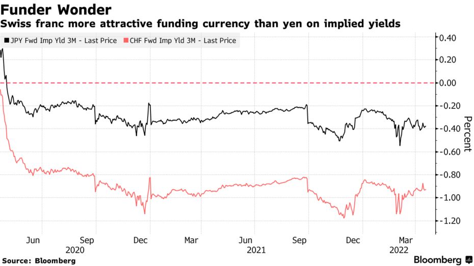 就收益率而言,“瑞士法郎感觉是比日元更好的选择”,三菱UFJ国际资产管理公司驻东京的首席基金经理KiyoshiIshigane说。随着日元持续走弱,“问题是,用日元做套利交易是否有利可图。”
