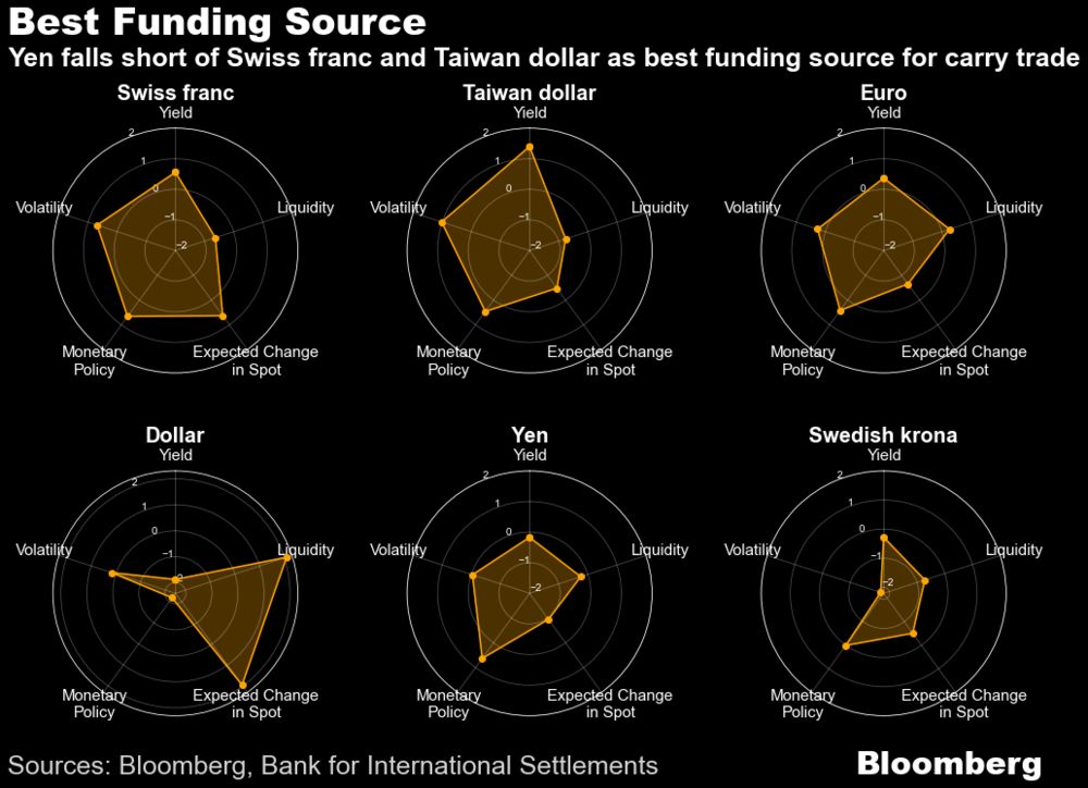 外媒的分析结果表明,鉴于日元跌势迅猛,套利投资者最好考虑瑞士法郎、台币和欧元,因其隐含收益率和波动性较低。