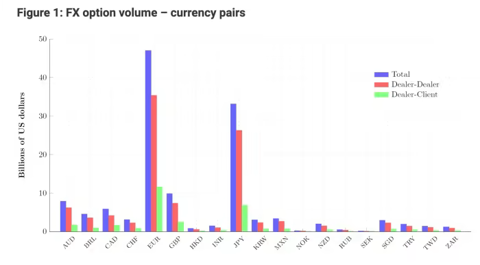在研究了两年内超过五分之二的全球外汇期权交易活动的数据后,研究人员发现,交易商间交易量占总交易量的四分之三以上。其中大部分交易集中在欧元、日元和英镑兑美元的期权上,押注外币兑美元走低的看跌期权的交易量几乎是看涨期权交易量的两倍。
