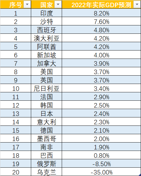 乌克兰战争冲击全球,一张图看IMF对20国经济最新预测!