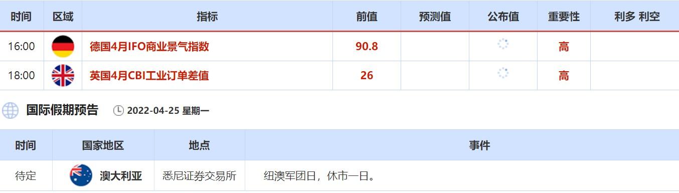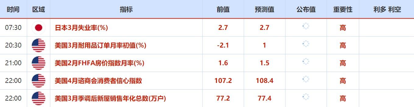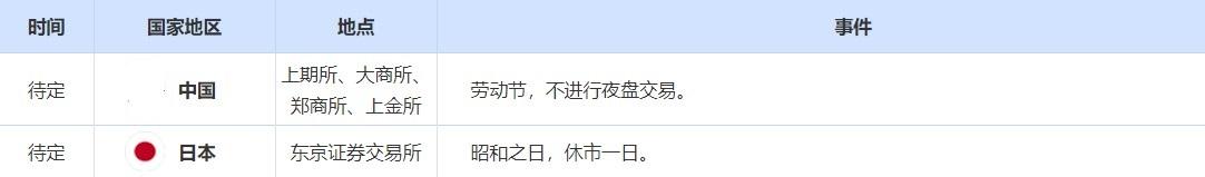 值得注意的是,4月29日,中国上期所、大商所、郑商所、上金所因劳动节,不进行夜盘交易。日本东京证券交易所,昭和之日,休市一日。