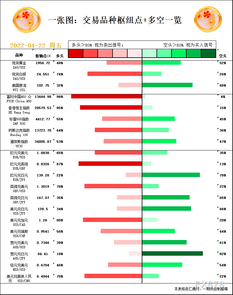 一张图:4月22日黄金白银、原油、股指、外汇“枢纽点+多空信号”;周五(4月22日)一张图看“枢纽点+多空信号”,品种包括:黄金、白银、原油、股指、欧元、英镑、日元、澳元、纽元、加元、富时中国A50、恒生指数、道指、标普500等。美联储主席开“金口”,空头士气大震,关注欧美PMI数据