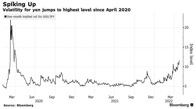 与此同时,日元的一个月隐含波动率目前已跃升至2020年4月以来的最高水平。交易员正在等待日本央行本周的议息会议,届时该行可能会对收益率曲线控制措施进行调整。鸽派的日本央行目前仍将政策利率维持在底部,而美联储则已开始筹谋大幅加息,这大幅推高了美元。