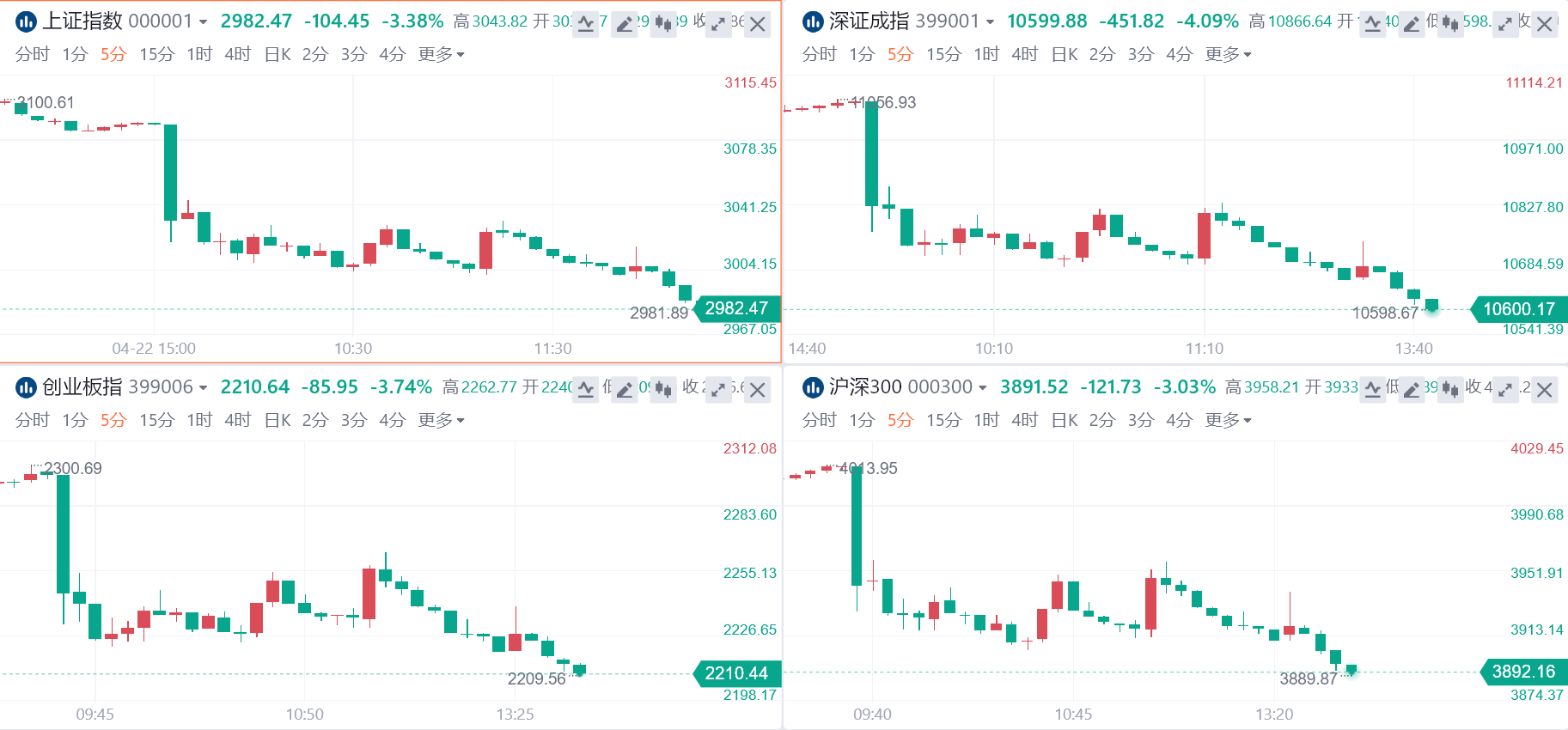 股市方面,A股三大股指低开,午后跌幅进一步扩大,深证成指跌幅扩大至4%,创业板指跌近3.7%,上证指数跌3.24%,自2020年7月以来首次失守3000点关口。沪深300指数跌破3900点,日内跌2.83%。