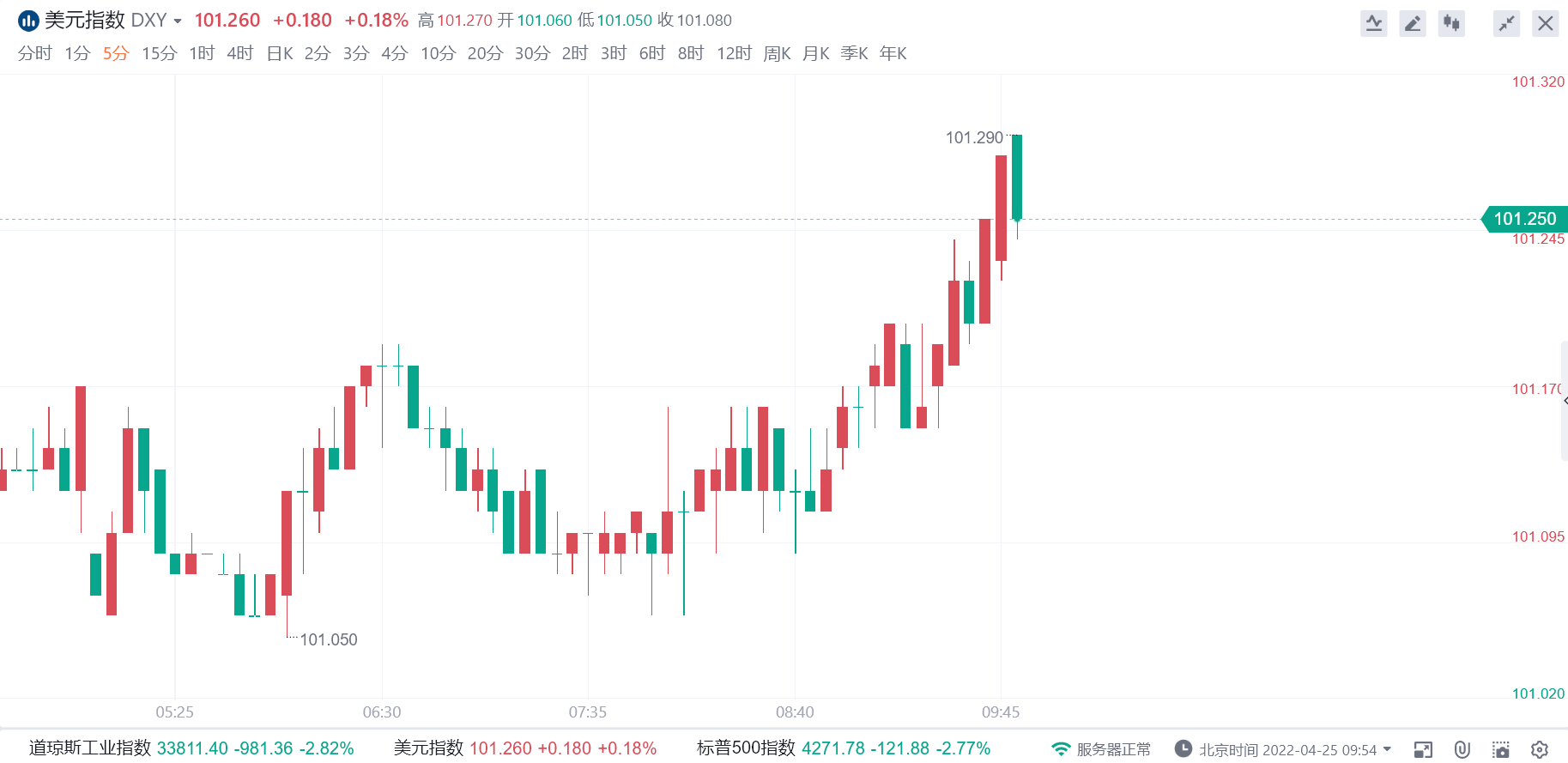 周一(4月25日)亚盘时段,全球多品类资产全线下跌,美元则逆势上涨,在101关口上方进一步走强。