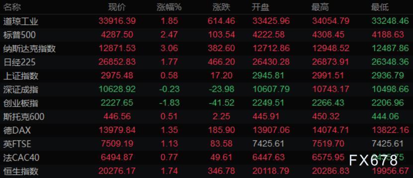 美股收盘情况:标普500指数上涨2.5%,报4287.5点;道琼斯工业平均指数上涨1.9%,报33916.39点;纳斯达克综合指数上涨3.1%,报12871.53点;纳斯达克100指数上涨3.5%,报13456.06点;罗素2000指数上涨1.8%,报1917.944点。