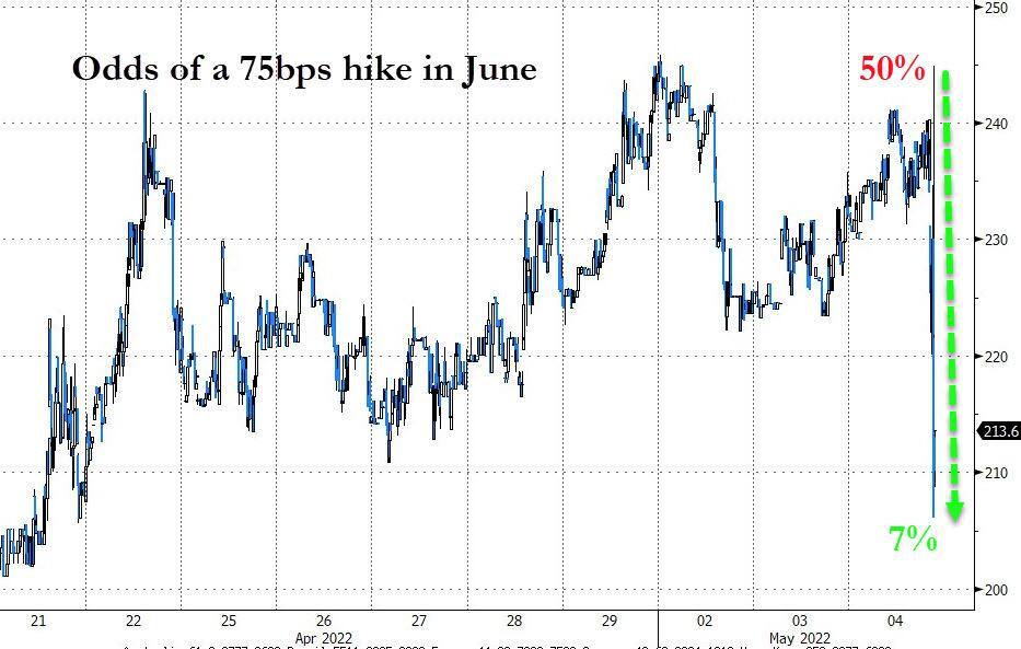短期利率市场立即排除了6月加息75个基点的可能性。