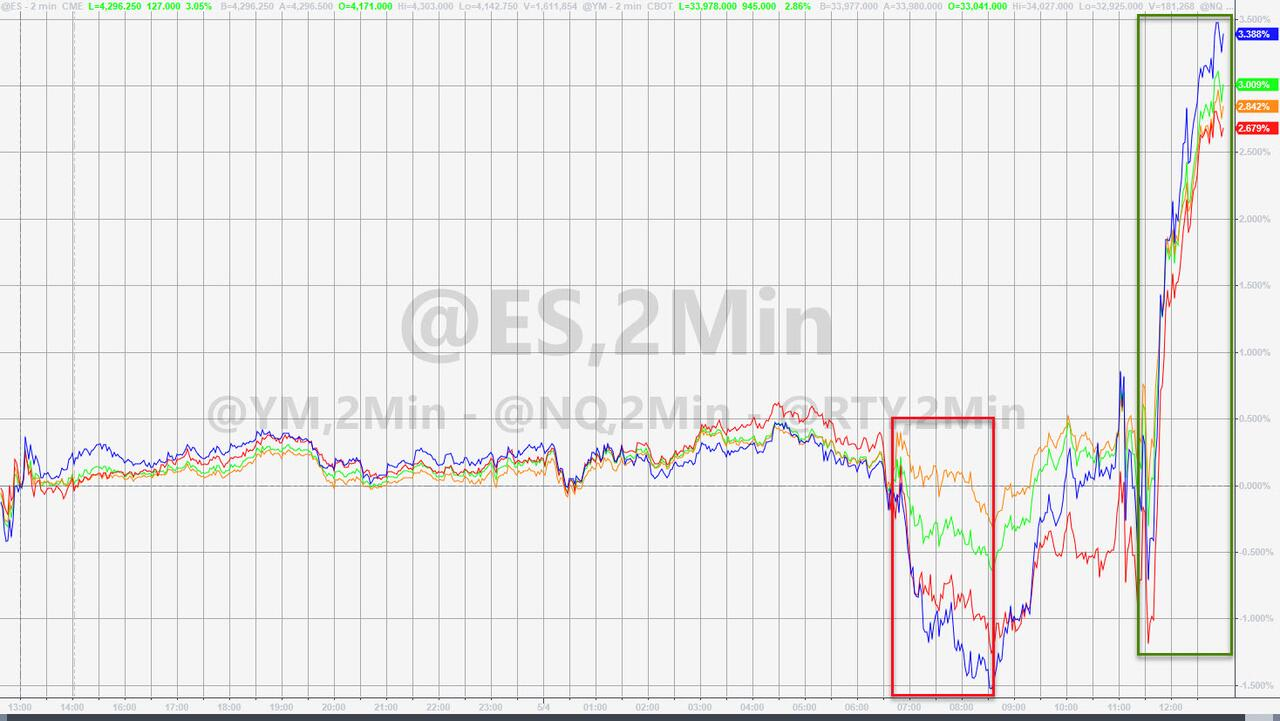 美股尾盘不断拉升,简直可以用“垂直”拉升来形容,纳指收涨3.19%,标普500指数收涨2.97%,道指收涨2.81%。