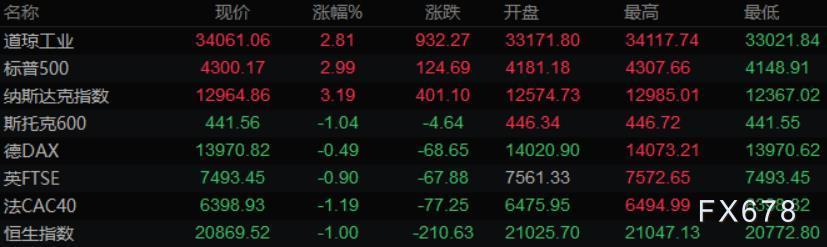 美股收盘情况:道琼斯指数收涨932.20点,涨幅2.81%,报34060.99点;标普500指数收涨123.92点,涨幅2.97%,报4299.40点;纳斯达克综合指数收涨401.10点,涨幅3.19%,报12964.86点。