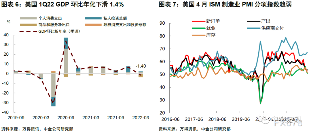 上次3月会议上,鲍威尔一直强调美国经济非常强劲(very strong),但上周公布的美国一季度GDP数据令市场“大跌眼镜”,GDP季调环比折年率下滑1.4%,远不及市场预期的1.1%。这一数据引发了市场对于美国增长动力不足,甚至可能走向衰退的担忧。虽然从分项数据来看,美国一季度消费与投资都还比较强,但历史上货币紧缩往往会导致衰退。另外,周一公布的4月ISM制造业PMI也有所放缓,其中,产出指数为两年来最低,就业指数的表现也不理想,而供应商交付指数却反弹。这说明美国企业面临的主要问题还是供给约束。无论如何,PMI走弱都会对市场预期造成一定负面影响。这次鲍威尔对于美国经济走势的看法是否有变,以及他如何理解货币紧缩与经济衰退的关系,都值得关注。比如经济放缓是否会成为制约美联储货币紧缩的因素,还有待观察。