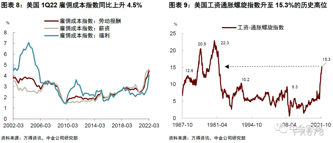 上周公布的雇佣成本指数(Employment Cost Index,ECI)显示,美国一季度整体劳动报酬成本较上一季度环比上升1.4%,同比上升4.5%,同比增速为二十年高位。ECI是统计雇主支付工资薪金和各项福利的季度数据,与月度非农就业报告提供的小时工资数据不同,ECI不会因职业或行业之间的“结构性”变化而扭曲,因此是美联储用来跟踪工资通胀风险的关键指标。鲍威尔曾在去年12月的议息会议后称,ECI大幅上升是美联储货币政策转向更激进立场的关键原因,而一季度的数据进一步确认了鲍威尔关于劳动力市场过热的观点[3]。在通胀已经高企的情况下,持续上涨的雇佣成本指数可能使得美联储更加担忧“工资-通胀”螺旋上升风险,从而加大货币紧缩的必要性。