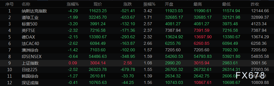 截至收盘,道琼斯工业指数下跌653.67点,或1.99%,至32245.7点;标普500指数大跌132.1点,或3.20%,至3991.24点,创2021年3月31日以来最低收盘水平;纳斯达克指数急挫521.41点,或4.29%,至11,623.25点。