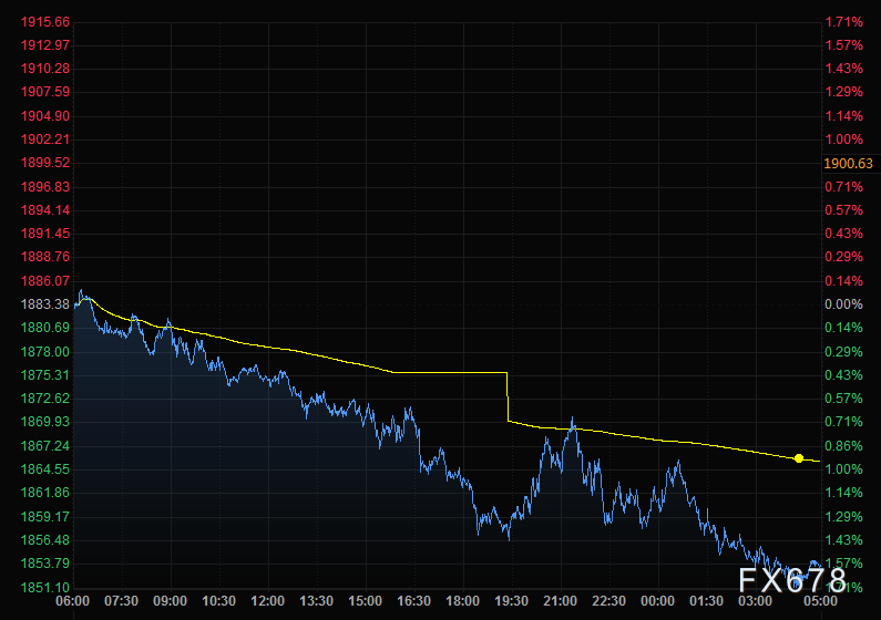 黄金价格周一继续回落,跌幅超过1%,随着美元在近20年高点徘徊,黄金的吸引力减弱。现货黄金跌1.4%,收报每盎司1853.92美元。美国黄金期货下跌1.3%,收报每盎司1,858.60美元。