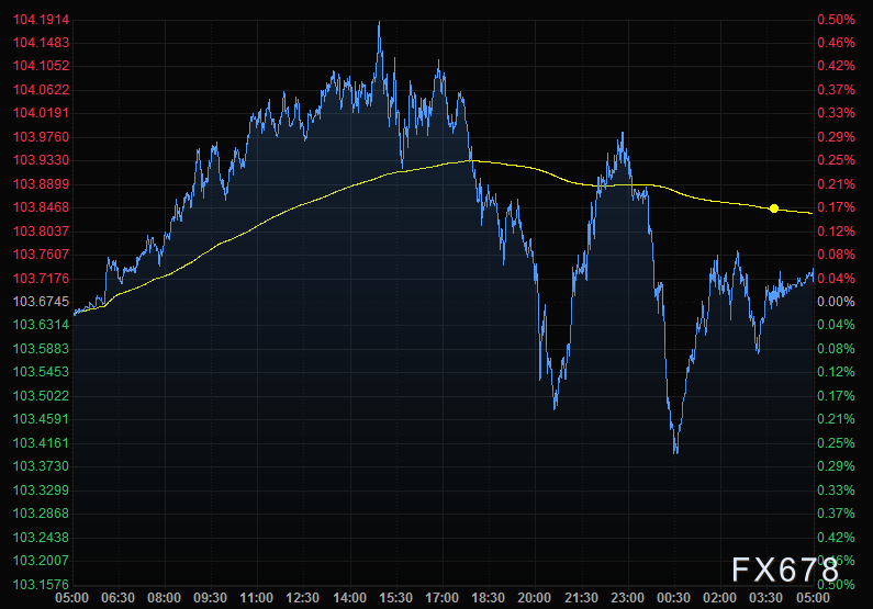 美元指数周一盘中最高触及104.19,为2002年12月以来最高,收报103.71,基本持平。欧元兑美元上升0.15%,报1.0556。