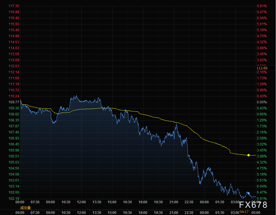 布论特原油期下跌6.45美元,结算价报每桶105.94美元,跌幅5.7%。美国原油期货下跌6.68美元,结算价报每桶103.09美元,跌幅6.1%。今年迄今,两大合约均上涨了约35%。
