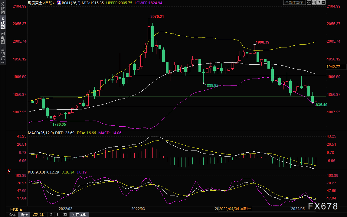 现货黄金最低触及1835.40美元/盎司,正好是200日均线附近,收报1837.80,盘中一度上涨0.6%。美国黄金期货下跌1%,结算价报1841.00美元。