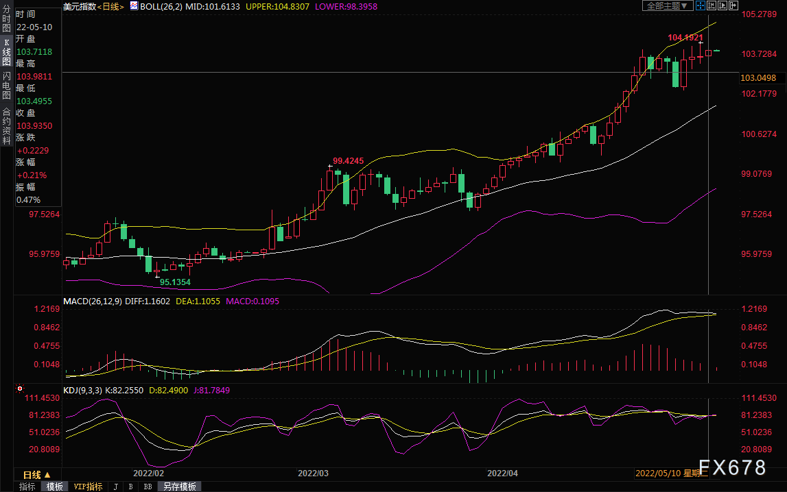 美元指数则、周二上涨0.20%,至103.93美元;欧元兑美元下跌0.27%,至1.0527美元。