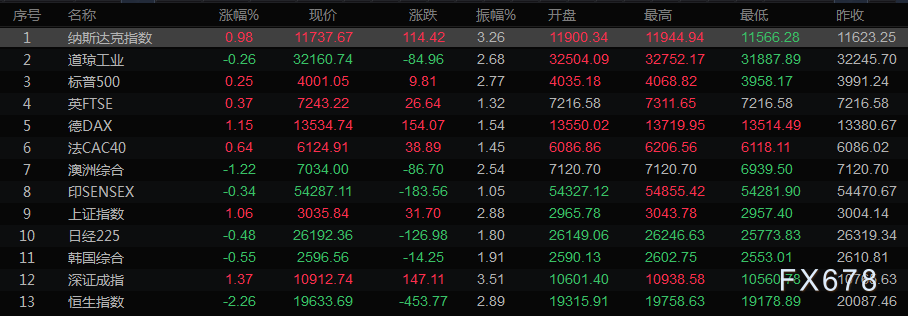 截至收盘,道琼斯工业指数下跌84.96点,或0.26%,至32160.74点;标普500指数上涨9.81点,或0.25%,至4001.05点;纳斯达克指数上涨114.42点,或0.98%,至11737.67点。