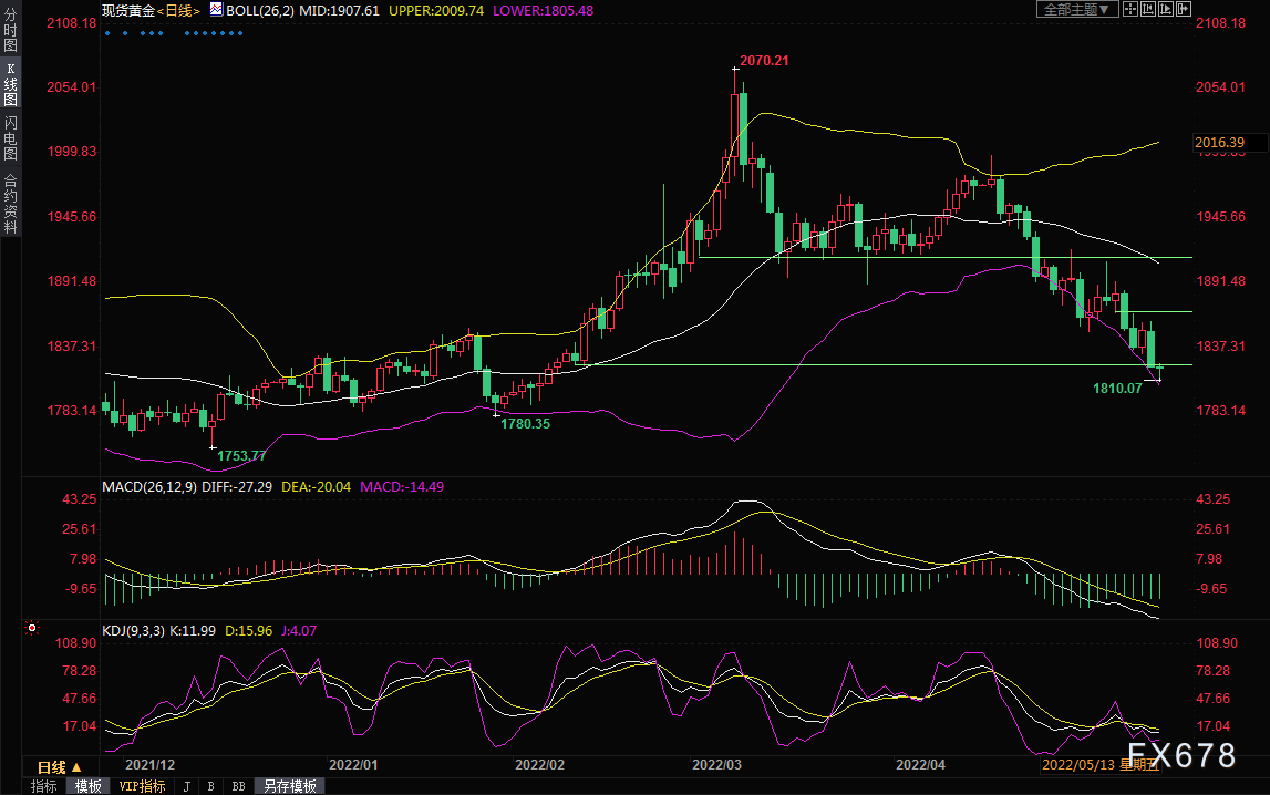 周五(5月13日)亚市盘初,美元指数守在隔夜创下的近20年新高附近,令金价继续承压,现货黄金一度创逾三个月新低至1810.07美元/盎司。美国参议院周四批准了鲍威尔执掌美联储的第二个四年任期,为他带领美联储对抗40年来最高通胀铺平了道路。投资者押注美联储将坚持激进加息,进而蜂拥买入美元,帮助美元刷新近20年高点至104.93,隔夜金价也直接失守200日1836附近关键支撑。国际油价周四小幅走高,因国际能源署(IEA)强调了全球燃料库存的紧张局面。