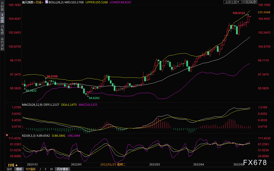 美元周四再度刷新近20年高点至104.93,收报104.75,涨幅约0.7%,市场持续担心,主要央行遏制高通胀的行动将抑制全球经济增长,这令美元的避险吸引力增强。