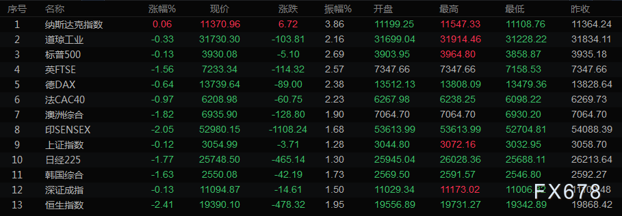 截至收盘,道琼斯工业指数下跌103.81点,或0.33%,至31730.3点;标普500指数下跌5.1点,或0.13%,至3930.08点;纳斯达克指数上涨6.73点,或0.06%,至11370.96点。