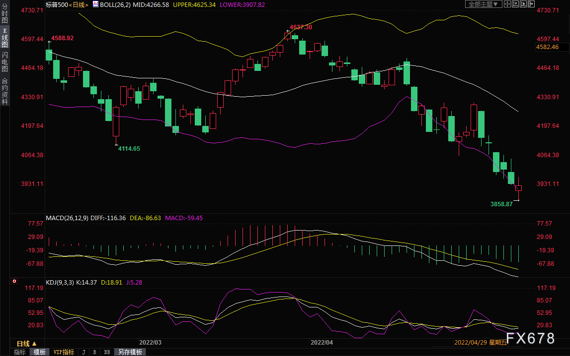 美国三大股指均在上日收盘点位上下来回波动,标普500指数在1月3日触及历史高位,目前距离确认进入熊市仅咫尺之遥。