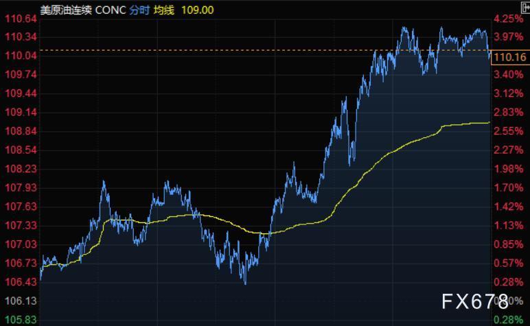 美油尾盘大涨3.8%,报110.16美元/桶,美国汽油价格飙升至历史新高,投资者担心如果欧盟禁运俄罗斯石油,供应将收紧。