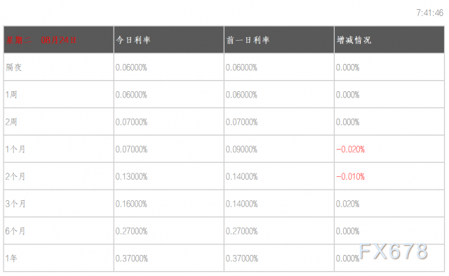08月24日香港银行间同业拆借利率港币:隔夜报0.06% 1周期报0.06% 1月期报0.07% 3月期报0.16% 6月期报0.27%