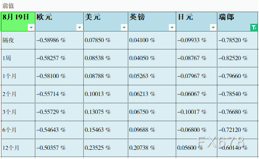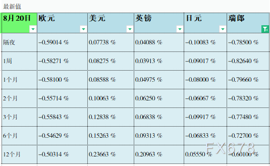 1周LIBOR:欧元报-0.58271%,美元报0.08275%,英镑报0.03913%,日元报-0.09017%,瑞郎报-0.82640%;