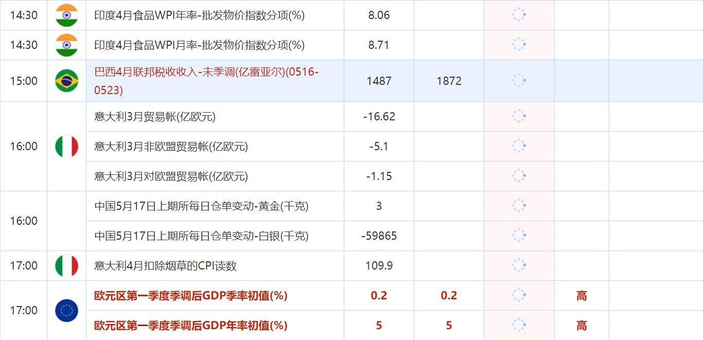 17:00 意大利4月扣除烟草的CPI读数 , 前值 109.9 , 预期值 -- , 公布值:待发布