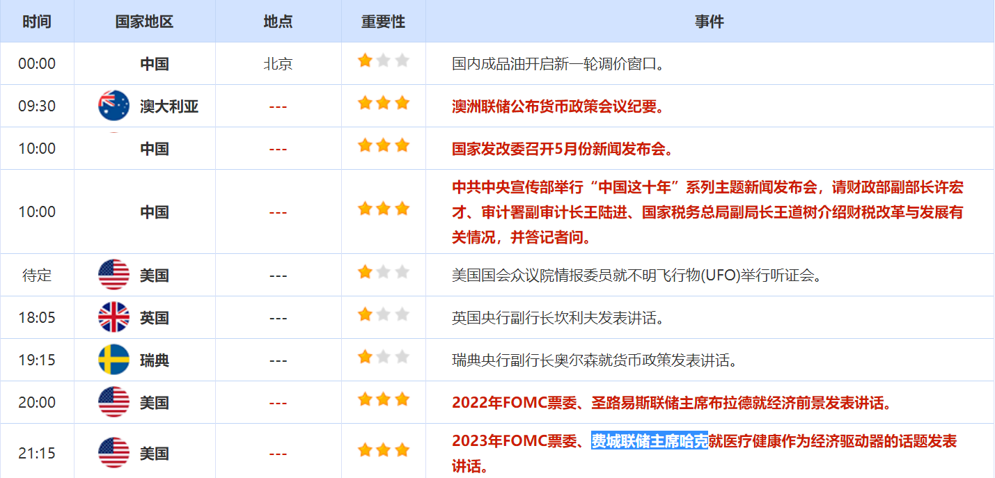 2022年5月17日,全球主要经济体将公布重要数据,需重点关注中国4月管道天然气进口,英国3月失业率,欧元区第一季度GDP,美国4月零售销售和工业产出等数据。大事方面需关注澳洲联储货币政策会议纪要,圣路易斯联储主席布拉德和费城联储主席哈克的讲话。