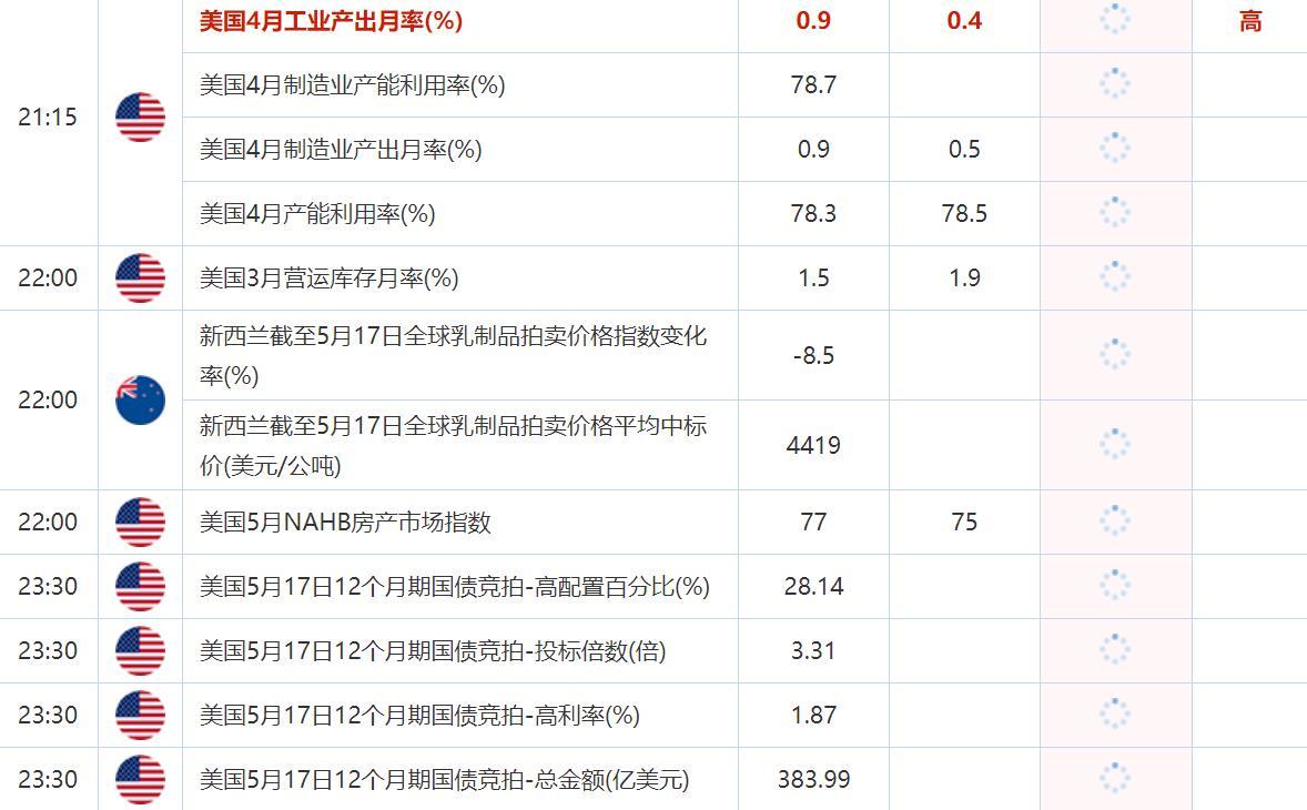 21:15 美国4月工业生产年率-季调后(%) , 前值 5.47 , 预期值 -- , 公布值:待发布