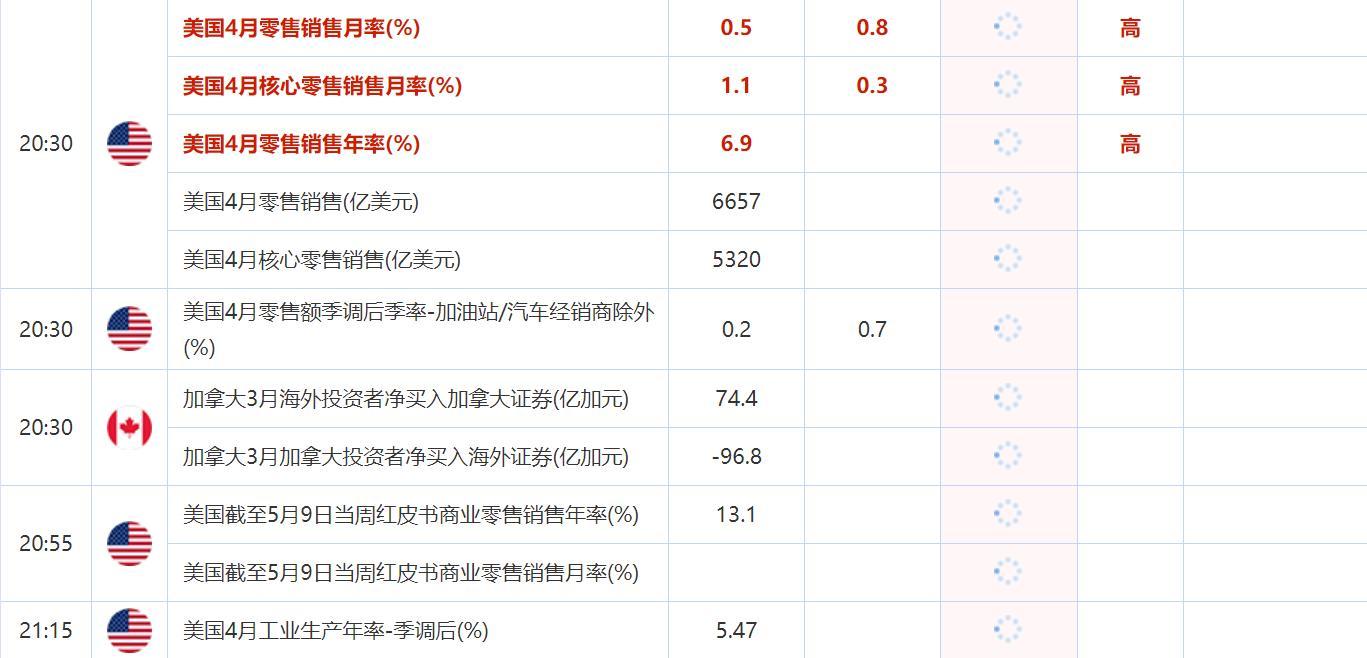 20:30 美国4月零售销售年率(%) , 前值 6.9 , 预期值 -- , 公布值:待发布