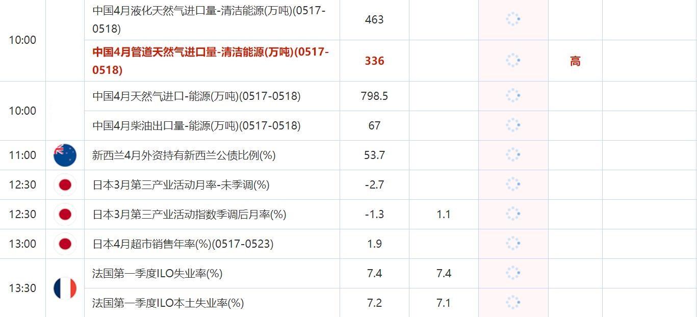 10:00 中国4月管道天然气进口量-清洁能源(万吨)(0517-0518) , 前值 336 , 预期值 -- , 公布值:待发布