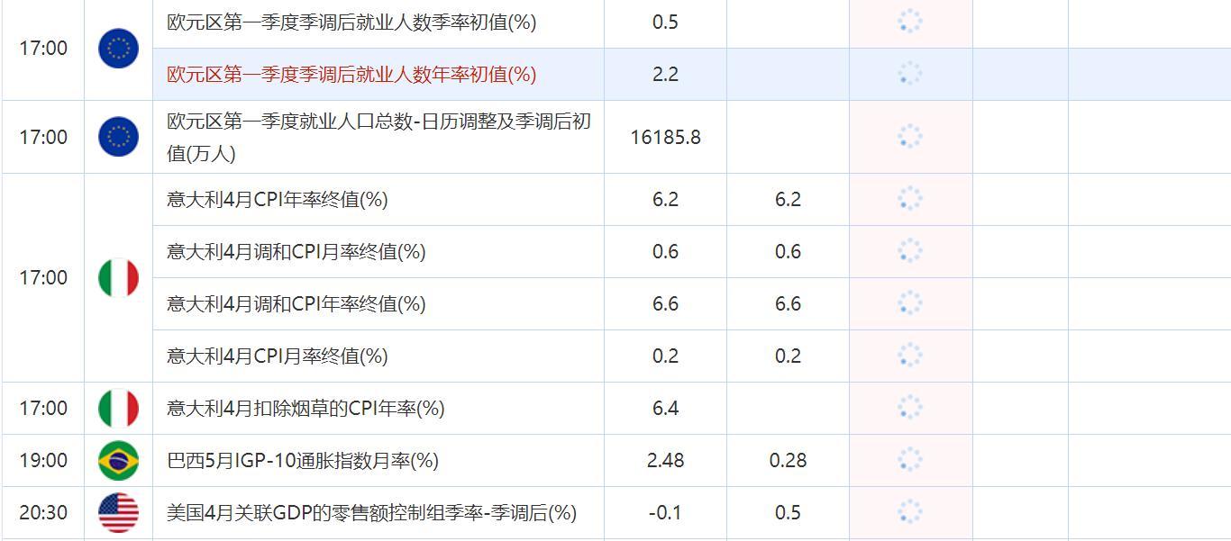 17:00 意大利4月CPI年率终值(%) , 前值 6.2 , 预期值 6.2 , 公布值:待发布